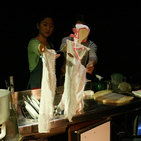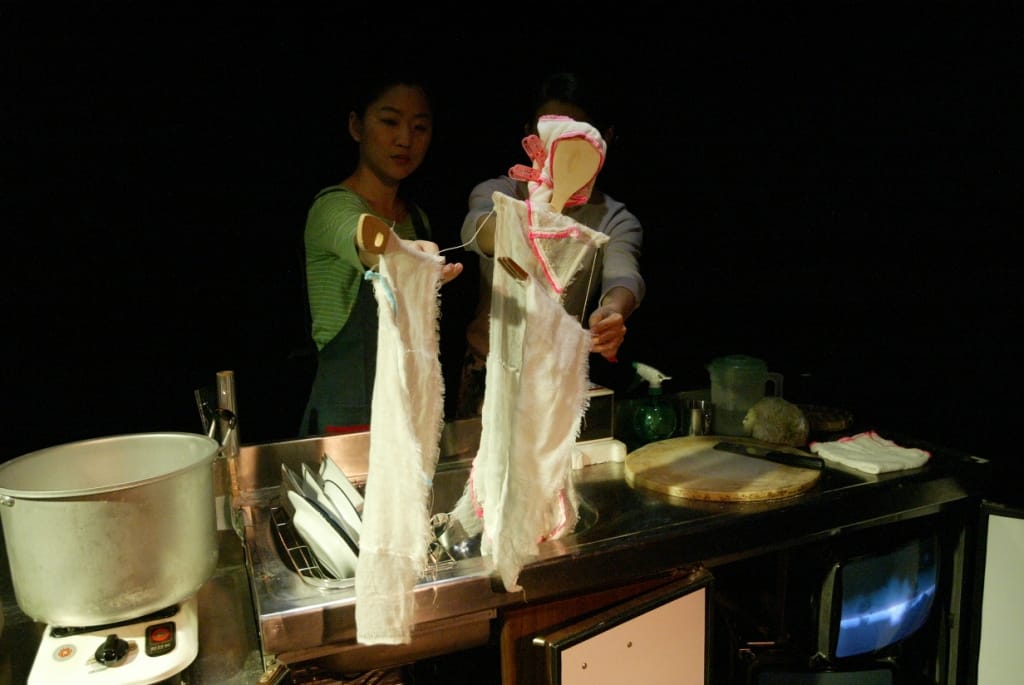 豐富多元的演出層次,透過真人與戲偶、影像與人、影像與偶的互動完成幻覺,強化人物人性寫實層面,帶領觀眾穿梭在現實與幻想之間,像是廚房異想世界。舞臺裝置為活動平台,寫實封閉的廚房造景,在日光燈閃爍下,簡單清楚地描述出台灣獨特的廚房氛圍,青色的女人心事。